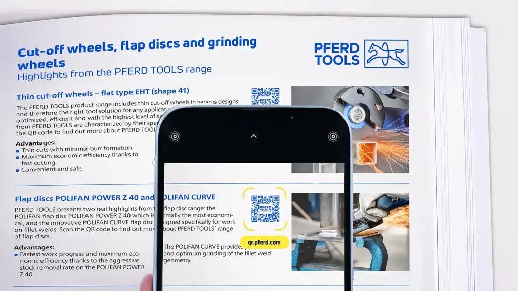 Oltre a brevi informazioni sul prodotto, il manuale degli utensili PFERD TOOLS offre anche approfondimenti multimediali su ogni singolo articolo del nostro assortimento. Potete accedervi tramite la versione PDF digitale cliccando sul codice dell'articolo.